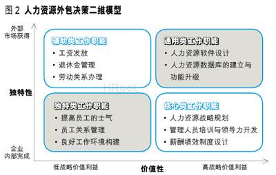 we团队建立了人力资源外包决策二维模型,帮助信用卡中心进行外包决策。该模型有两个基本维度:价值性和独特性。价值性是指如果一项人 力资源职能或活动能为企业带来与顾客价值相关的战略性利益,那么它就具有高的价值。独特性是指如果一项人力资源职能或活动只能在企业内部进行,或在外部市 场上难以获得,那么它就是有独特性的。