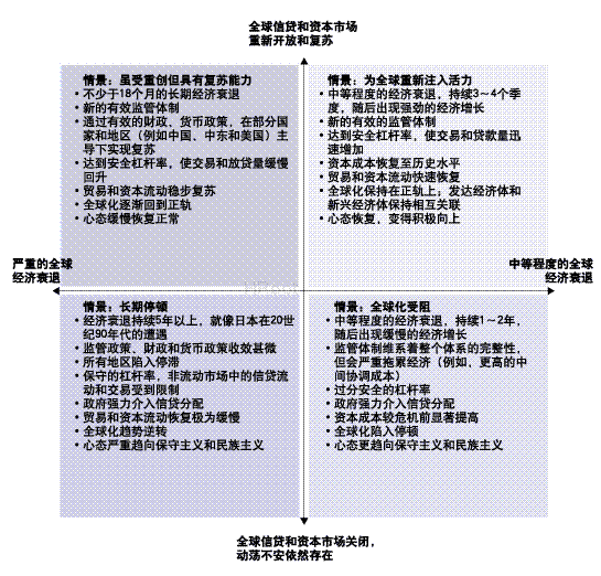 在第二种情景中,政府在全球信贷和资本市场中取得的进展被全球经济衰退的影响所抵销,这种成果被负面影响抵销的局面将持续长达18 个月,甚至更久,这进一步扩大了信贷损失,使跨境交易方彼此间的不信任感日益加重。不过,虽然这次经济衰退持续时间之长、影响之深是过去70年中从未有过的,但政府采取的行动还是收到了成效,全球资本和信贷市场也在逐步复苏。虽然多少有点摇摆不定,但全球的信心的确在回升,贸易和资本流动也在逐步恢复生机。全球化慢慢回到了正轨。