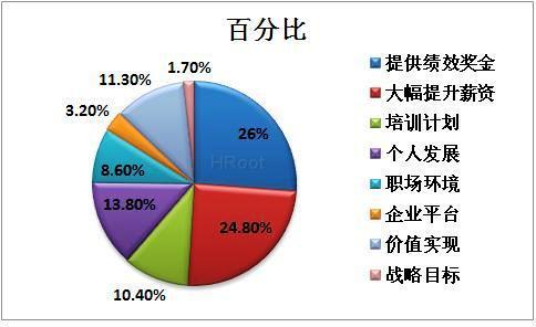 调查内容包括:战略目标、企业平台、职场环境、薪酬福利、个人发展、价值实现六个方面内容。结果显示:管理人员更为关注企业平台,主要体现在组织、流程、沟通方面;员工层更为关注薪酬福利的个人付出与回报;操作层更为关心个人发展和培训机会。其中:绩效奖金、培训和员工发展计划是挽留有才能的员工的最有效手段,结果如图三、图四所示:
