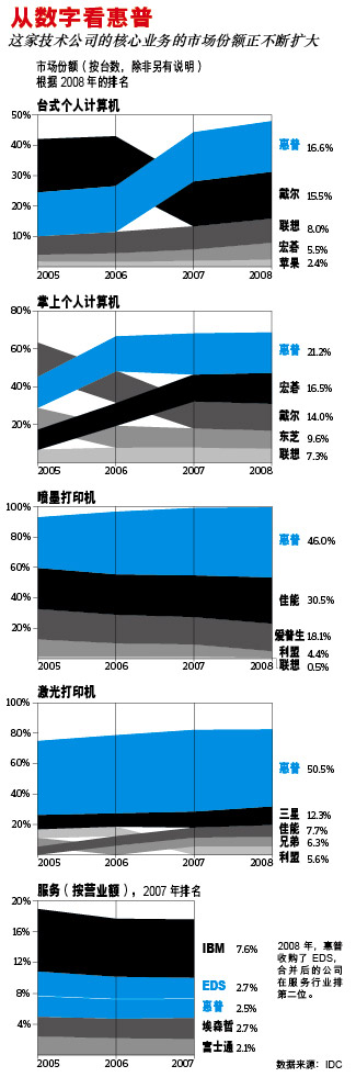 不过,赫德目前抱怨的还是自他加入惠普以来就一直面临的问题:它在开展业务时仍然非常混乱。他似乎在暗示,惠普公司还可以进一步精简,收购 EDS 的行动使这个目标更容易实现了。一年前,投资者还强烈反对这项交易,因为 EDS 的业绩实在太糟糕了。如今惠普公司已经获得了两个立竿见影的好处。首先,原来的 EDS 公司从赫德的效率中获得了益处。其次,惠普赢了,因为技术咨询业务不受经济周期的影响:取消了硬件采购的公司往往会购买更多的服务,这样它们才能维护现有的设备。