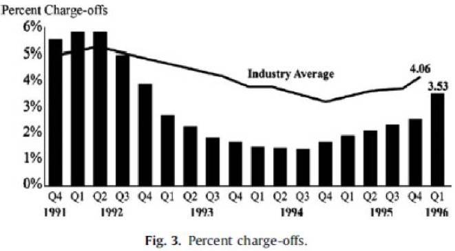可以从下图1看出,在测试的早期,Capital One的坏账率水平非常高,达到行业平均水平的2-3倍。